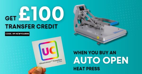 Don't forget to use CODE: HP-NEWYEAR100 to get £100 Custom Heat Transfer Credit when you purchase any Auto Open Heat Press. Offer valid until February 14th.
