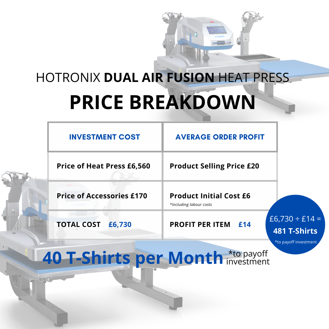 If you are making at least £14 profit on each garment you sell and you can sell 149 of those garments, that equals the exact amount you would need to payoff the Hotronix Dual Air Fusion IQ Heat Press plus £170 worth of essential accessories.