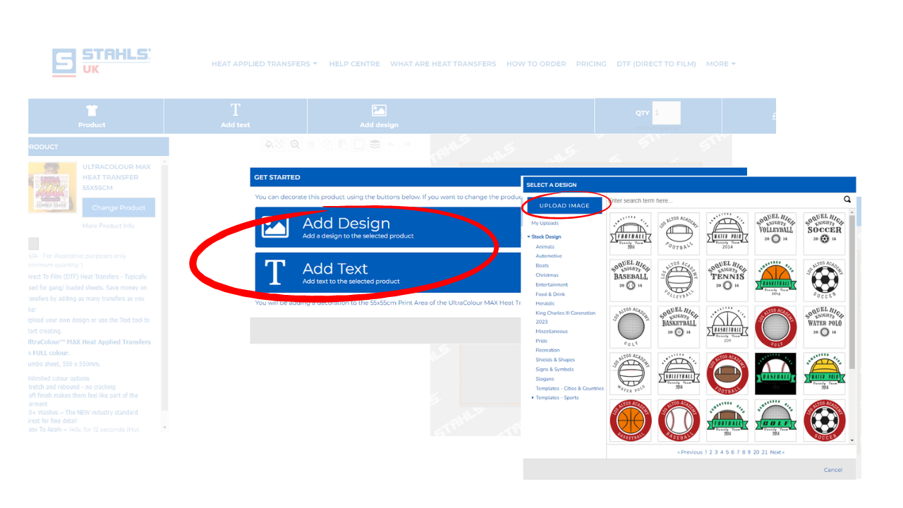 Clicking the 'Add Design' feature will take you to Stahls' UK's complimentary stock library which you can edit and amend for your use, free of charge.