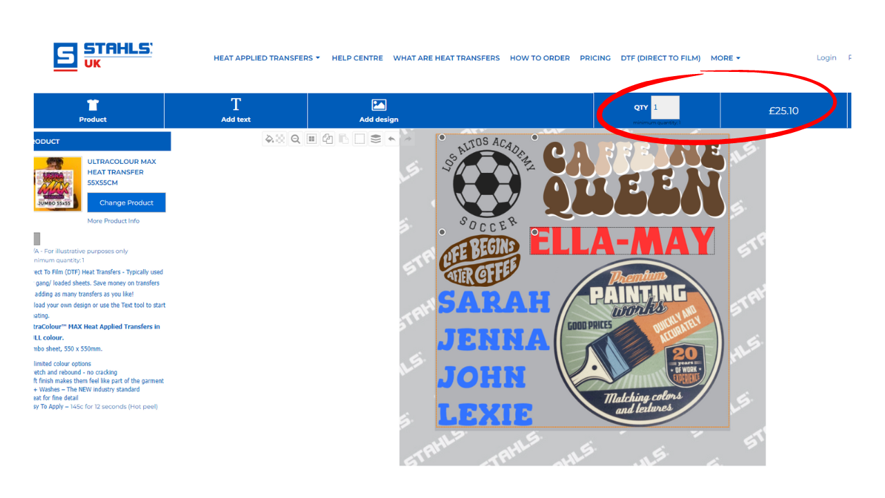 Arrange your designs to find the sizing you want on the page. When you are happy, adjust your quantity in the white box circled below and it will offer you a price quote beside it.