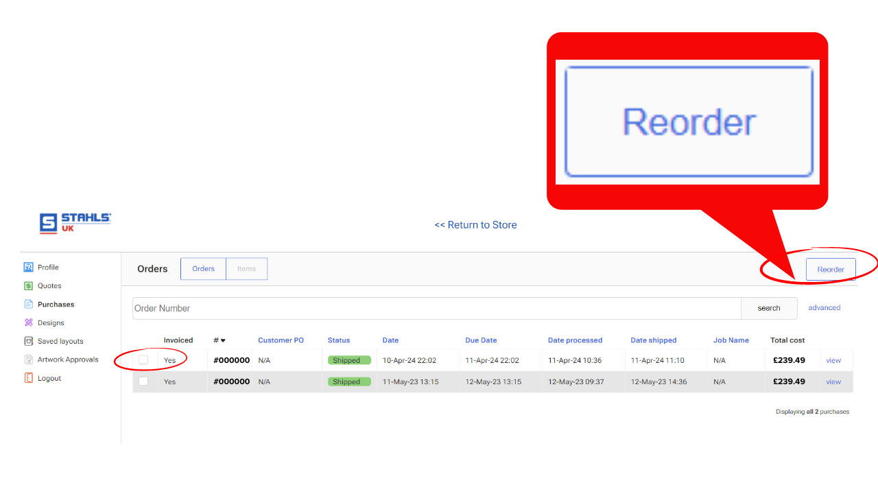 Once in this section, find the order you wish to reorder and click the left hand tick box beside it.