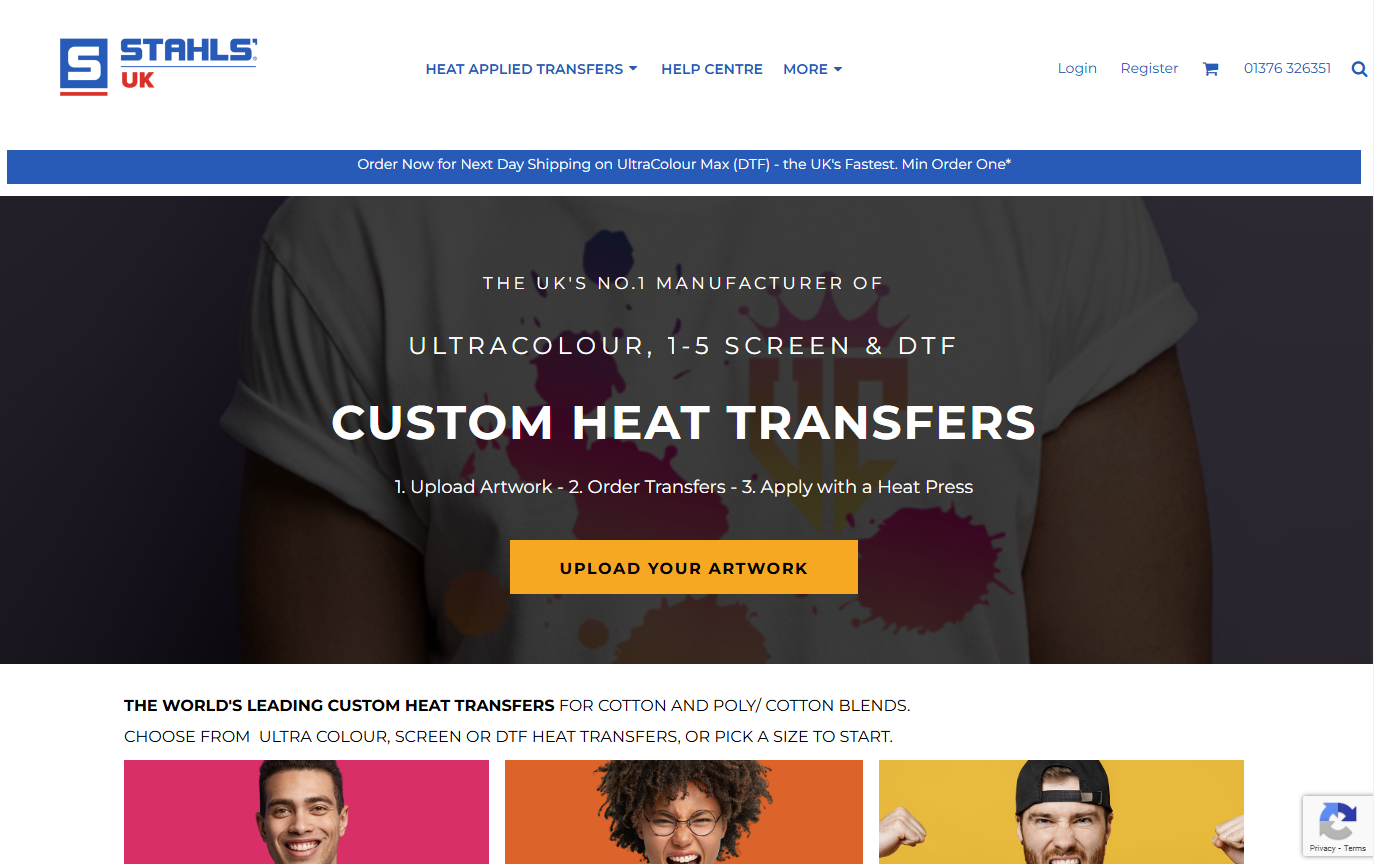 Once you are on the website, pay special attention to the navigation bar. Here you will find access to the Heat Transfer section, the Help Centre and other useful pages such as Free template download pages. If you want to learn more about artwork requirements, minimum orders, payment types and other FAQ's, please head to the help centre section.