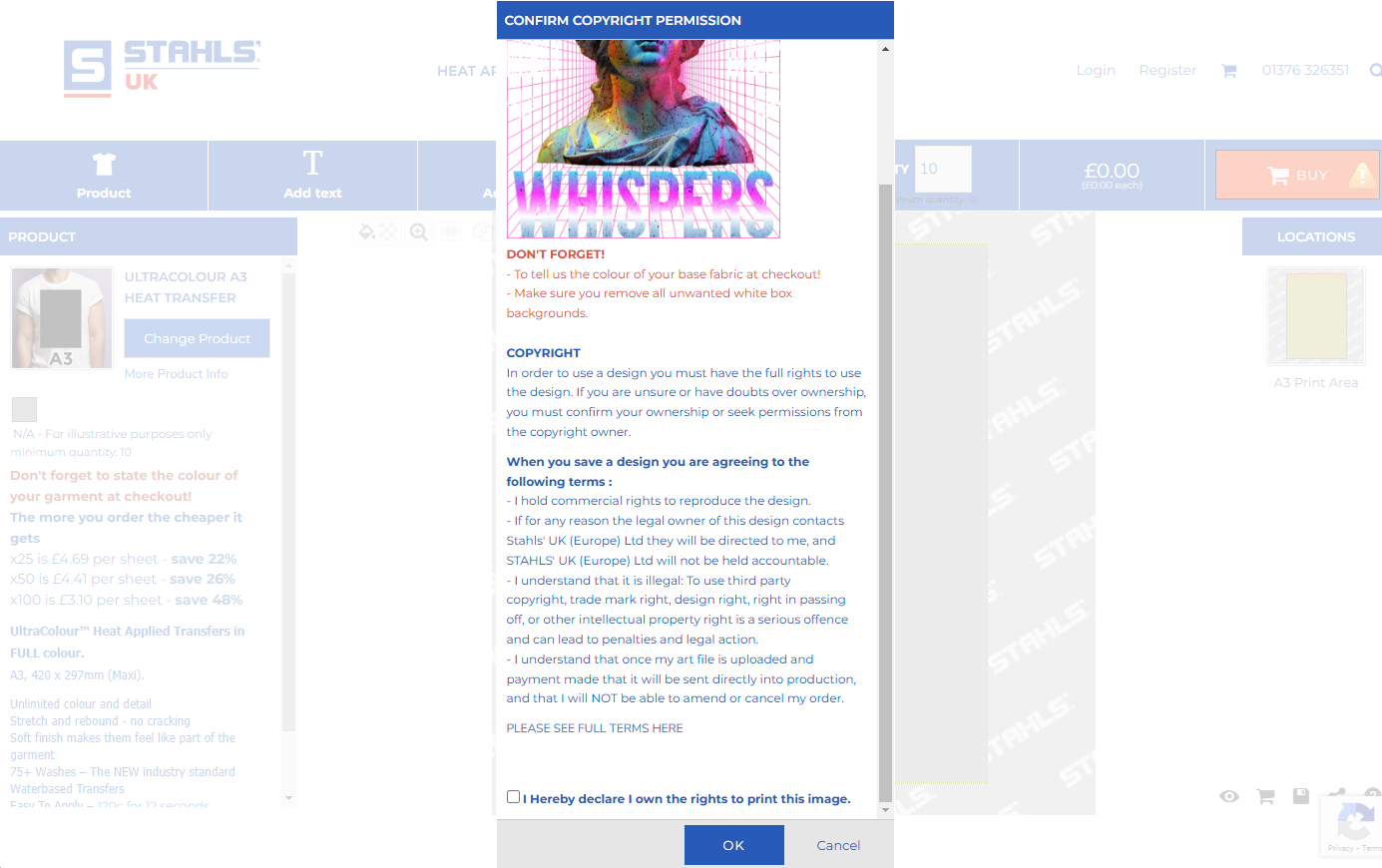 You also must accept the copyright usage permissions to the design you are uploading. It is illegal to use third party copyrighted or trademarked designs without proper permission or licencing.