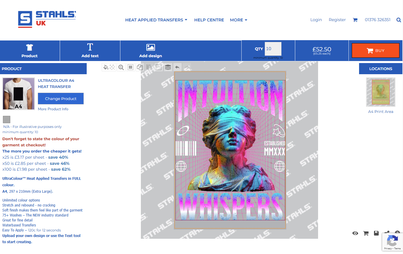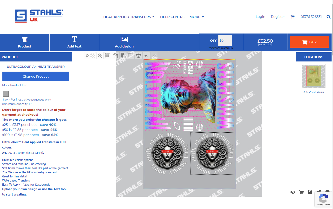 Can I order just one transfer per sheet? Yes. You can indeed. However, our sheets are priced so that you get the best pricing the more you order. So if you're looking for 2x A4 designs at the best price, upload them to an A3 sheet and you will find that your pricing per design works out cheaper than ordering 2x A4 sheet designs.