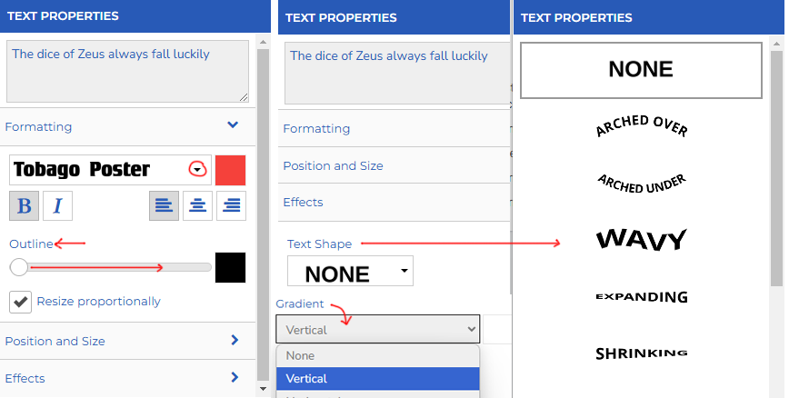 - Text Shaping - Arched, Wavy, Expanding, Shrinking, Fish Eye, Squeeze, Bridge, Half Bridge, Ramp, Perspective