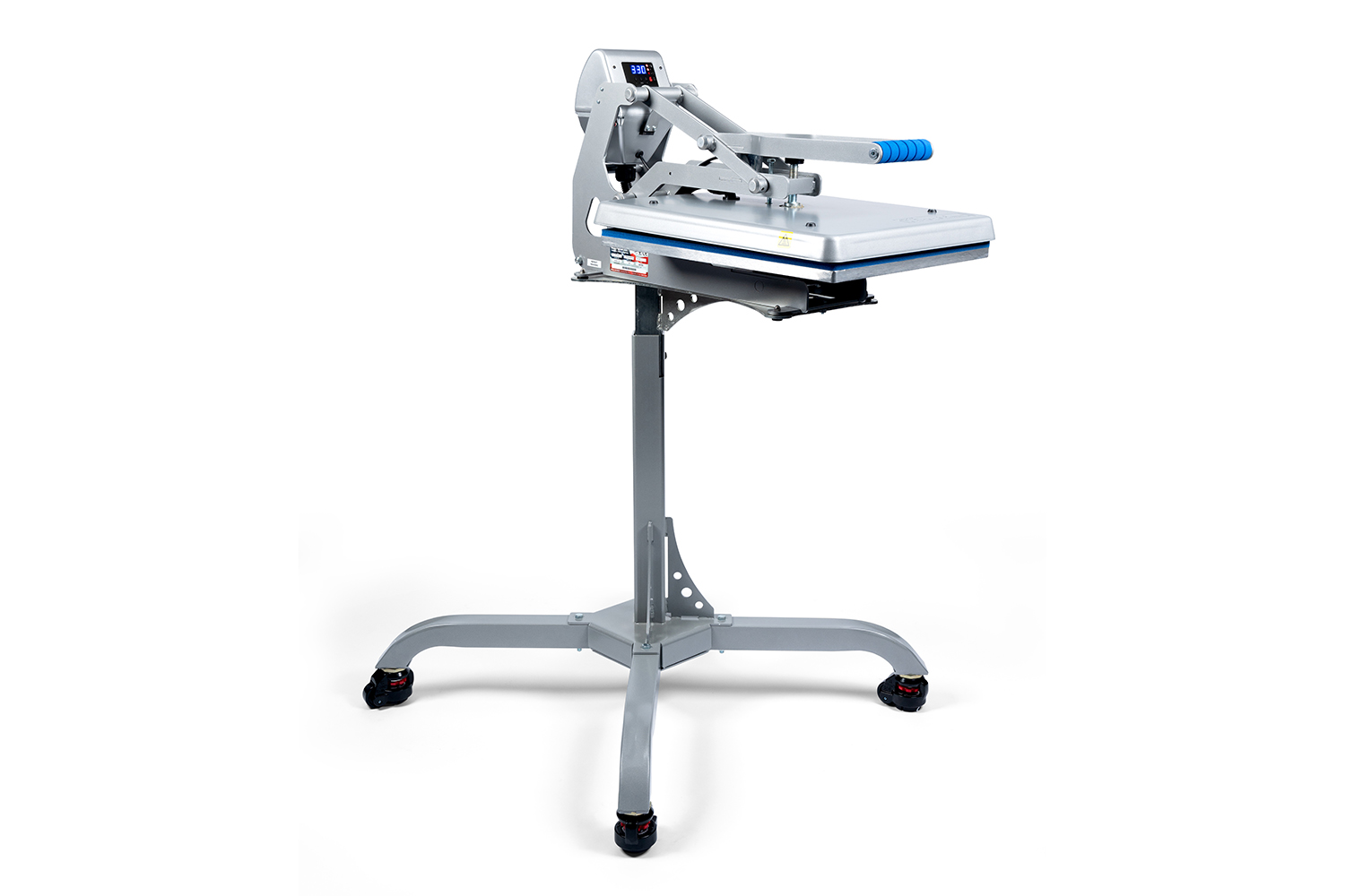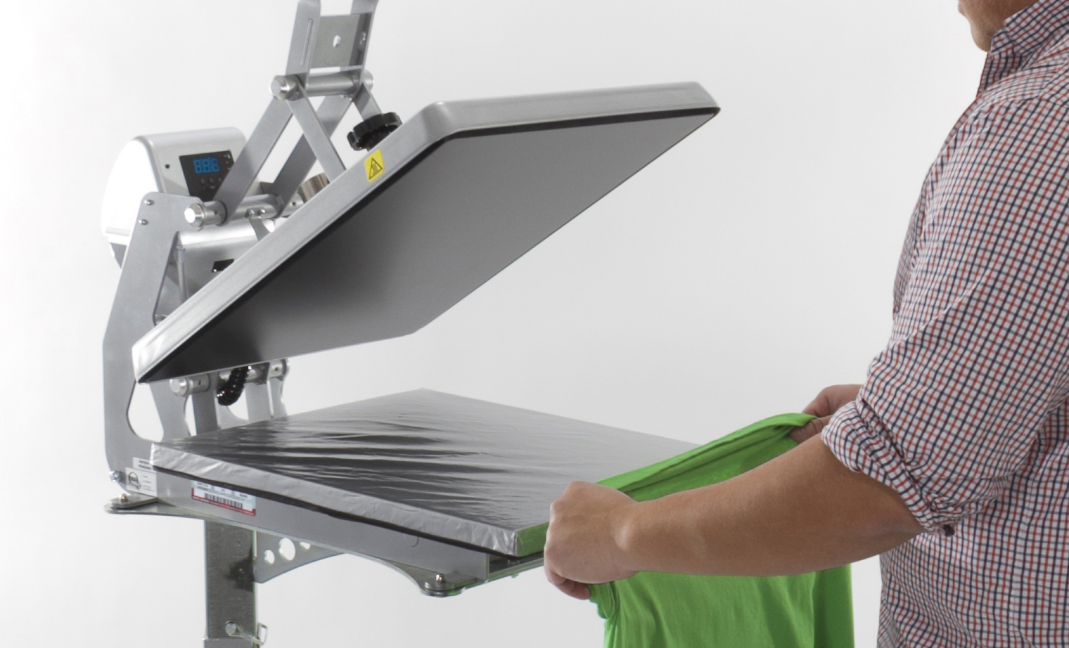 Enter threadability! Available on all good heat presses, this allows you to slide the garment onto the press, isolating the layer you want to print on. Add a Counter Caddie or Caddie Stand, and voila! You shave off precious seconds, bringing your time down to 47 seconds per t-shirt.